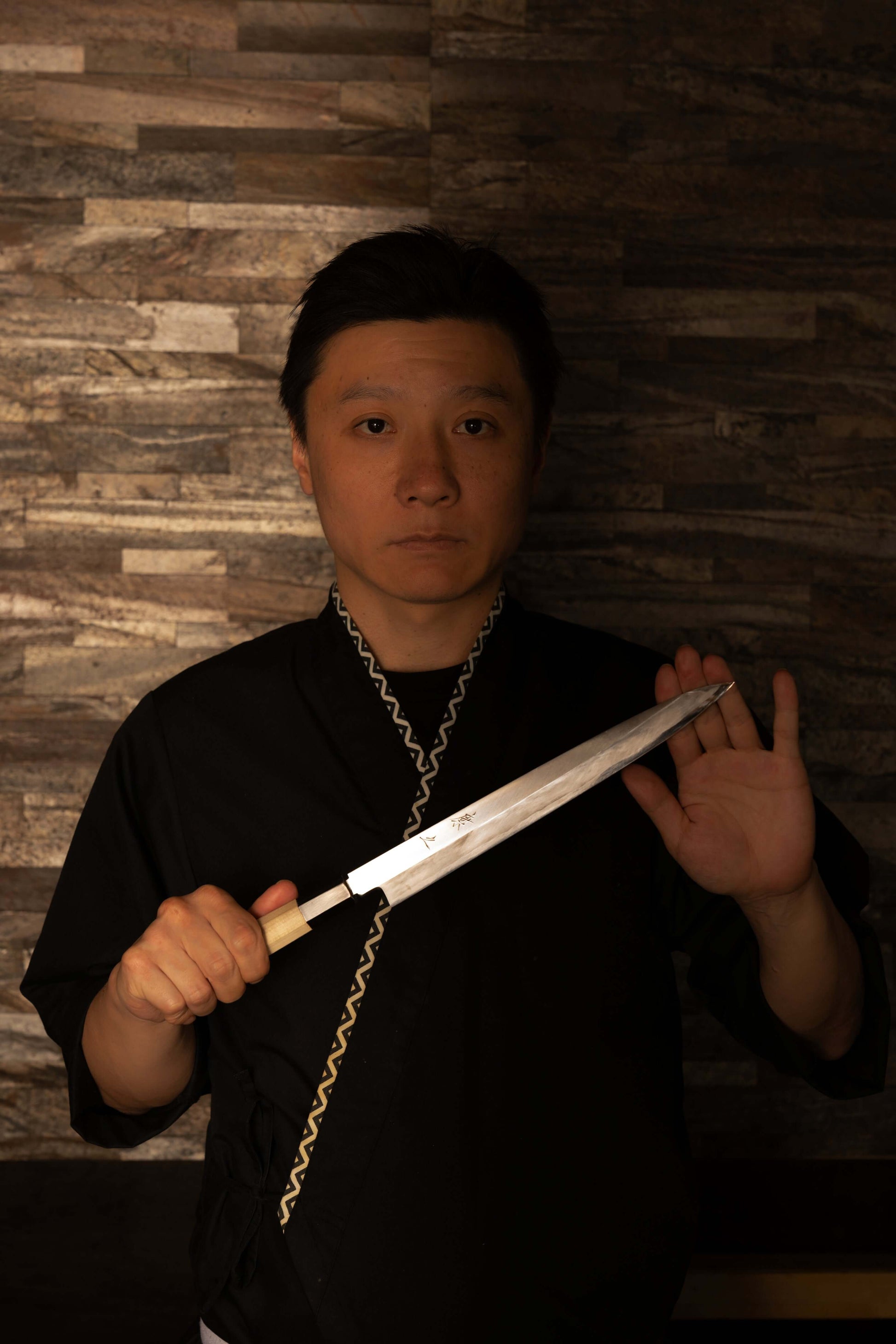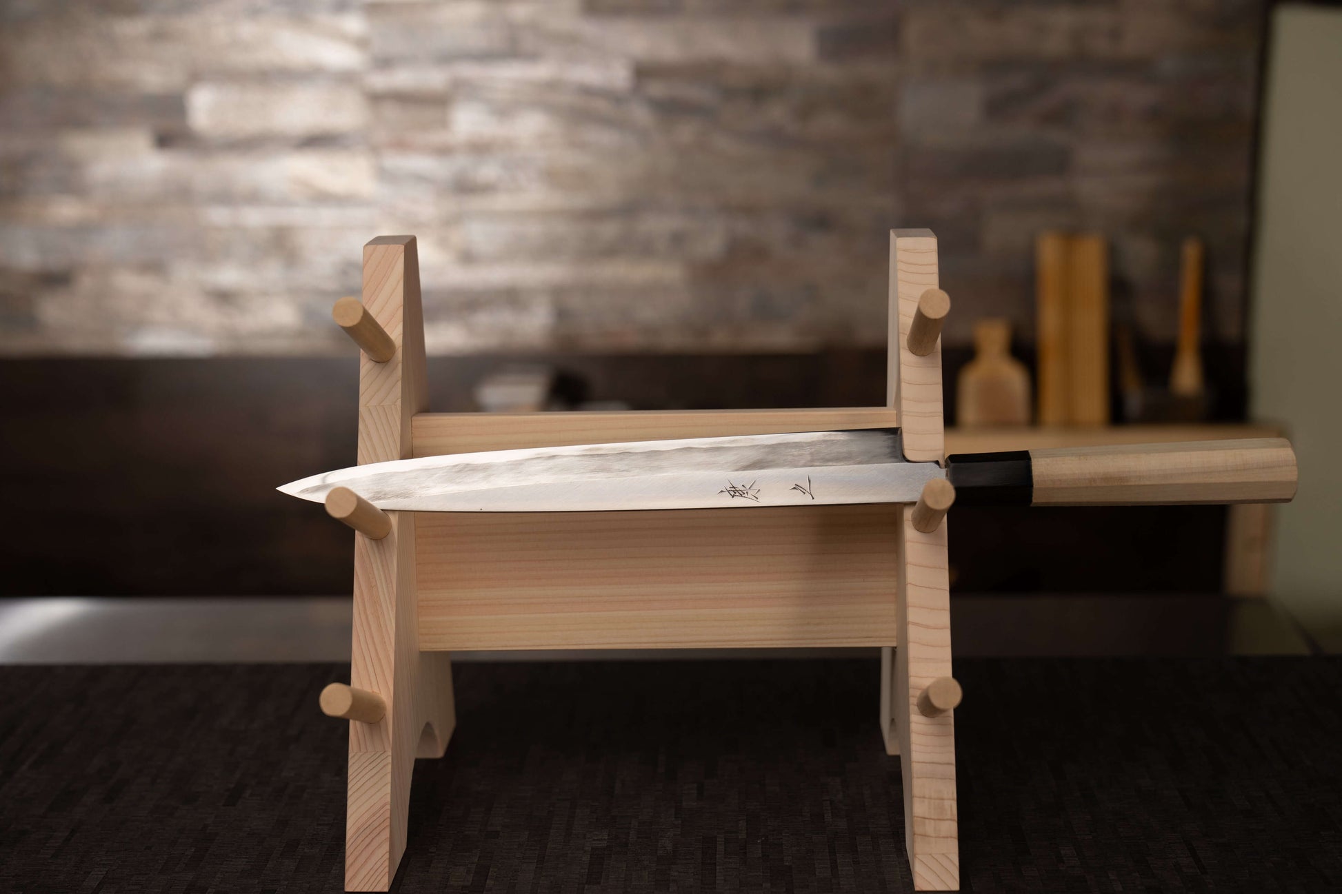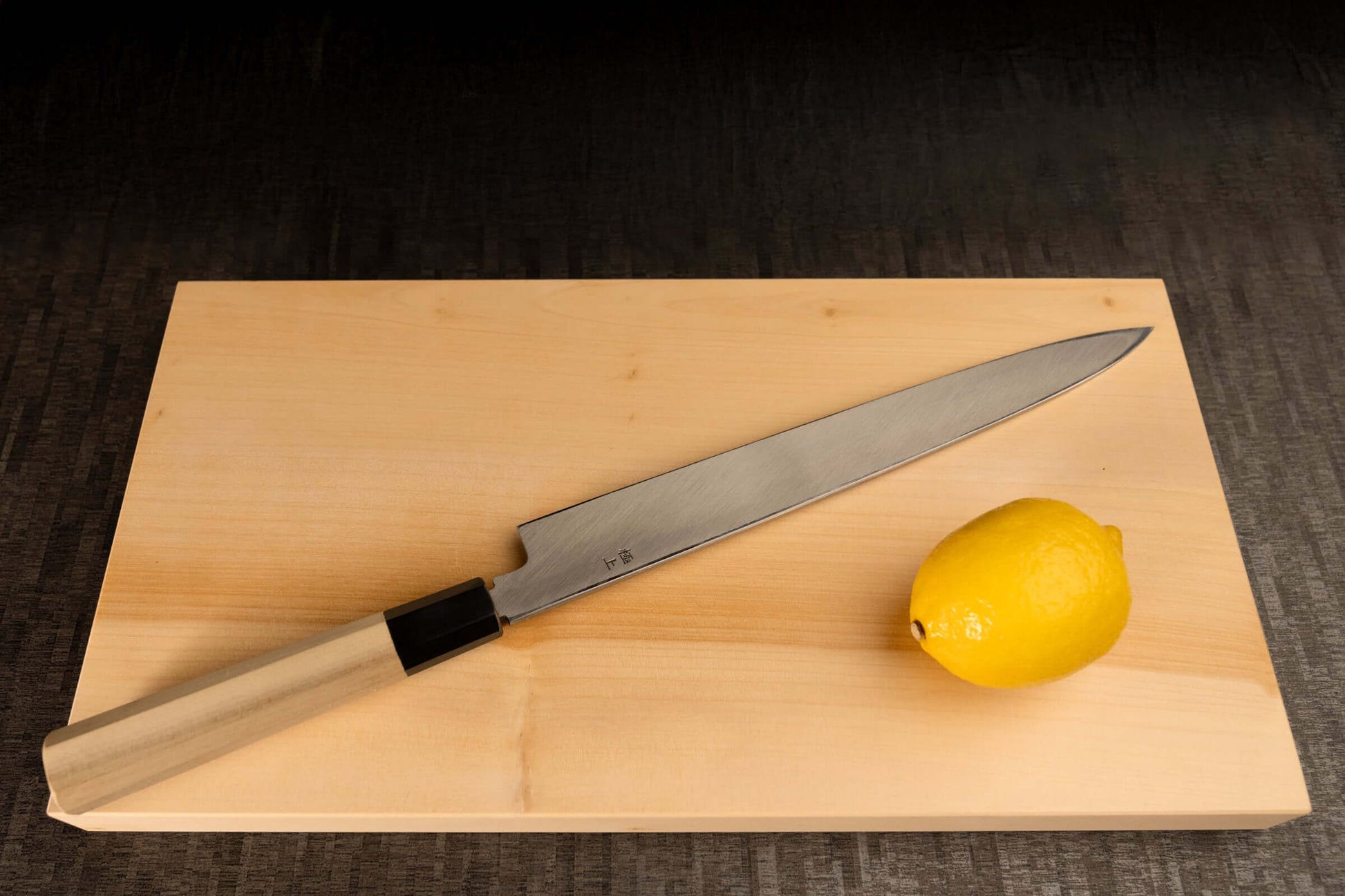 This one-of-a-kind 270mm sashimi knife is forged in the Yanagiba style—designed to produce clean, uninterrupted slices of sashimi with grace and clarity. Hand-forged in Sakai, the slim single-bevel blade glides through fish fibers without bruising or tearing.