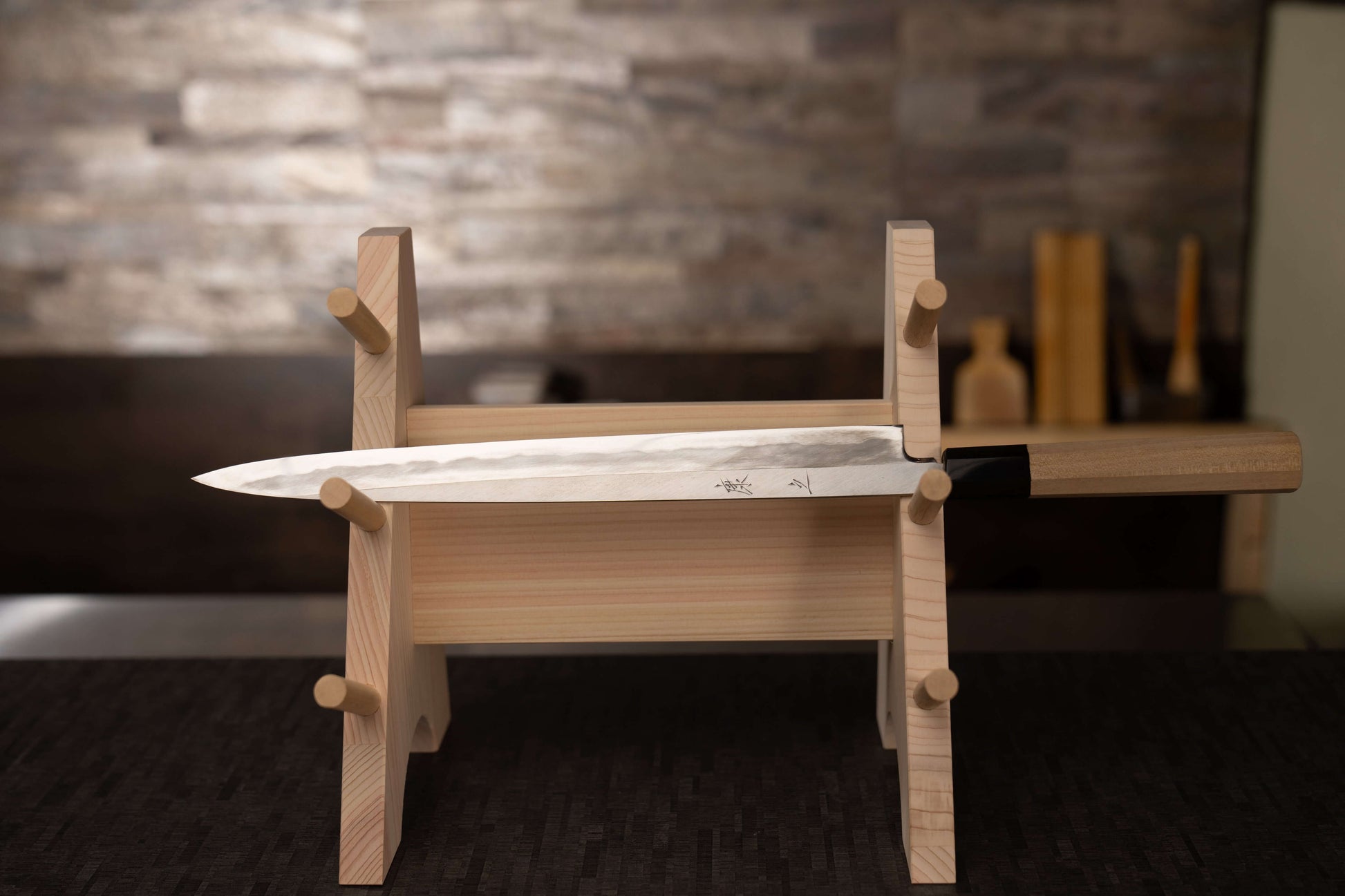 This one-of-a-kind 300mm sashimi knife is forged in the rare Fugubiki style, crafted to slice pufferfish (fugu) into impossibly thin, transparent pieces. Hand-forged in Sakai, the ultra-thin single-bevel blade delivers breathtaking delicacy with extraordinary control.